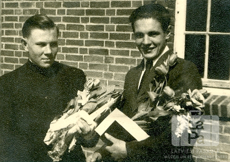 Divi draugi pēc iesvētībām Emdenes nometnē (angļu zonā). Puišiem rokās ir ziedi un dokumenti; fonā ir ķieģeļu siena un logs. No kreisās: Marģers Caune un Osvalds Blauss.