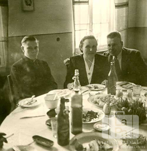 Trīs cilvēki sēž pie galda iesvētību mielastā Emdenes nometnē (angļu zonā). Uz galda ir ēdienu un dzērienu trauki un pudeles. Fonā ir logs. No kreisās: Marģers Caune, Lūcija Caune un Teofilds Dārziņš.