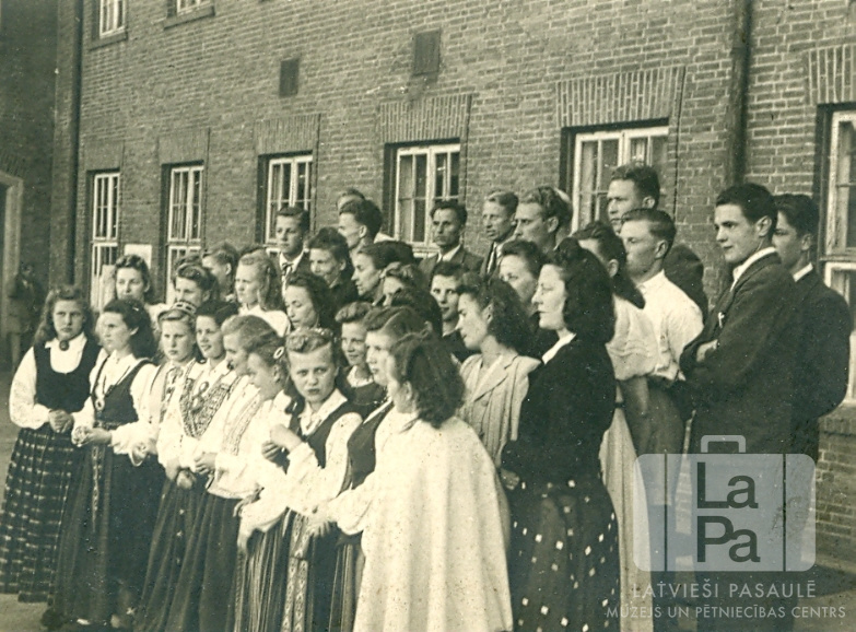 Andreja Pumpura ģimnāzijas koris bērnu svētkos Emdenes nometnē (angļu zonā). Koristi stāv ķieģeļu ēkas priekšā vairākās rindās; priekšā stāv jaunietes tautastērpos. Pirmajā rindā, no kreisās: otrā Ilze Sapraša, trešā Māra Cībante, piektā Asja Straģe, sestā Ingrīda Kārkliņa un septītā Skaidrīte Svinne. Otrajā rindā, pirmā no labās Astrīda Gruziņa.