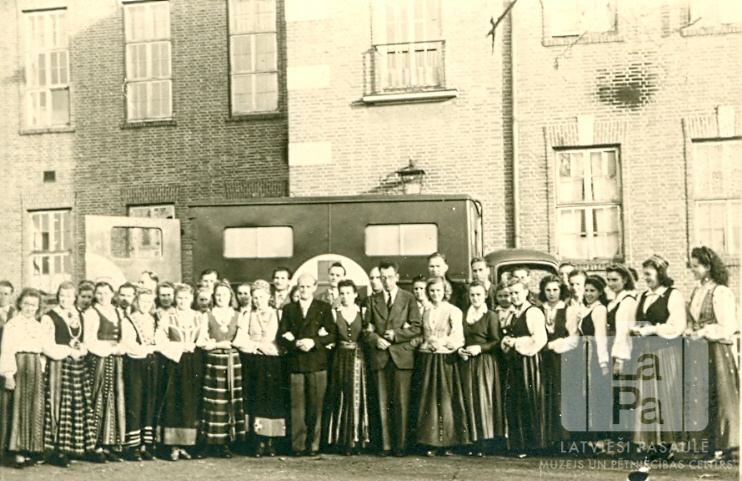 Andreja Pumpura ģimnāzijas koris bērnu svētkos Emdenes nometnē (angļu zonā). Koristi stāv garā rindā; jaunietes ir ģērbušās tautastērpos. Fonā smagā kravas mašīna ar atvērtām aizmugurējām durvīm stāv vairākstāvu ķieģeļu ēkas priekšā. Pirmajā rindā, no kreisās: astotais Valentīns Šloss (ģimnāzijas kora diriģents), desmitais Mārtiņš Gaide (ģimnāzijas direktors).