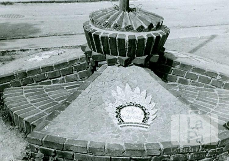 Karoga masta pamatdaļa ar redzamu Latvijas armijas simboliku – karavīru saulīti – Hohfeldes nometnē Augsburgā (amerikāņu zonā). Masta pamatdaļu būvēja latviešu inženieru un mākslinieku vadībā; tā bija veidota trīs daļās – no krāsainiem akmentiņiem tika veidots Latvijas ģerbonis, karavīru saulīte un auseklis.