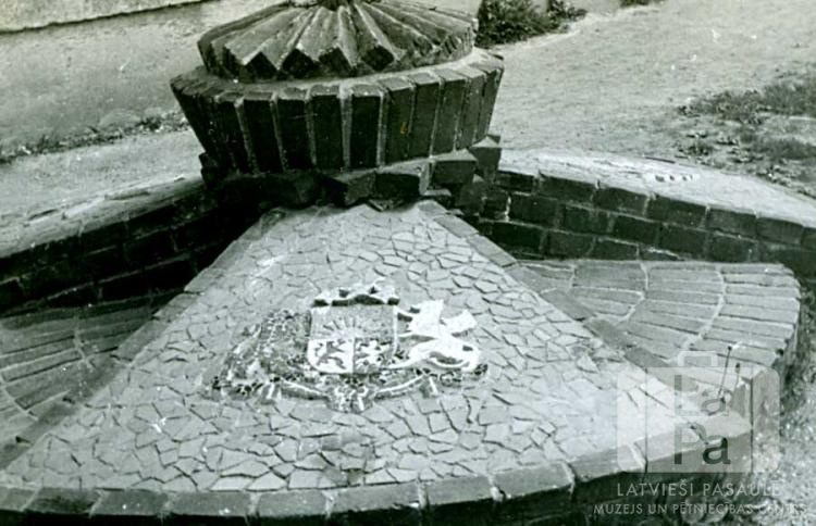 Karoga masta pamatdaļa ar redzamu Latvijas ģerboni Hohfeldes nometnē Augsburgā (amerikāņu zonā). Masta pamatdaļu būvēja latviešu inženieru un mākslinieku vadībā; tā bija veidota trīs daļās – no krāsainiem akmentiņiem tika veidots Latvijas ģerbonis, karavīru saulīte un auseklis.