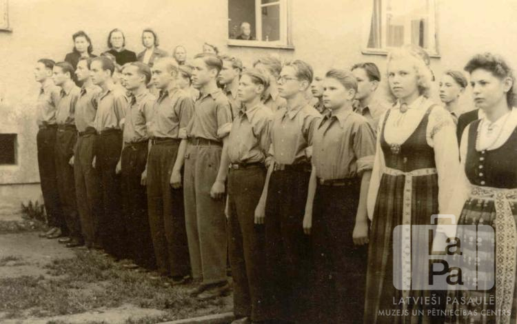 Ģimnāzistu ierinda vienā no pirmajām dienām Ausekļa ģimnāzijas pastāvēšanas laikā Hohfeldes nometnē Augsburgā (amerikāņu zonā). Priekšplānā, rindas labajā pusē, stāv divas jaunietes tautastērpos. Visa pārējā rinda sastāv no jaunekļiem tumšās biksēs un gaišos kreklos. Aizmugurē ir vēl viena rinda ar puišiem. Fonā ir ēka, pie tās stāv trīs sievietes; pa ēkas logiem skatās cilvēks.