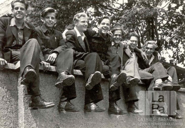 Humanitārās klases skolēni no Ausekļa ģimnāzijas Hohfeldes nometnē (amerikāņu zonā) 1947. gada pavasarī sēž rindā uz betona mūra. Puiši ir pārlikuši vienu kāju pāri otrai; daļa ir uzlikusi rokas viens otram uz pleciem. Fonā ir koks. Skats no apakšas. No kreisās: Dzintars Cukurs, Rainis Krīgēns, Vilis Kukainis, Aivars Aistars, Ivars Ozoliņš, Māris Ubāns un Jānis Indāns.
