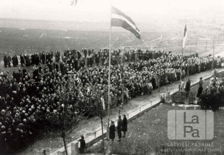 Latvieši pulcējas karoga pacelšanai Latvijas Valsts svētkos Hohfeldes nometnē Augsburgā (amerikāņu zonā). Priekšplānā pie karoga masta stāv Ausekļa ģimnāzijas skolēni. Masta galā plīvo Latvijas karogs. Sanākusi ir liela cilvēku grupa. Pie karoga stāv, no kreisās: Lidija Januma, Marģers Cubīns un Balva Inka.
