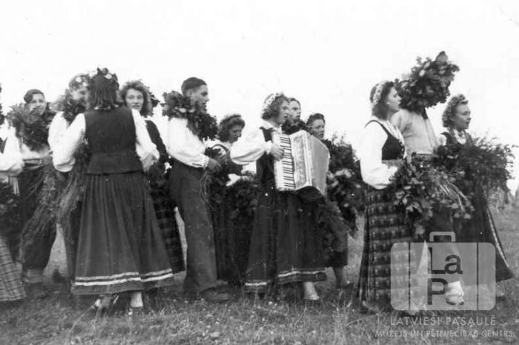 Ausekļa ģimnāzijas skolēni no Hohfeldes nometnes Augsburgā (amerikāņu zonā) ierodas uz Jāņu svētku svinēšanu. Jaunieši tautastērpos un ar vainagiem ap kaklu/ uz galvas un jāņuzālēm rokās iet dziedādami. Vidū ir redzama Verēna Stelpe (ar akordeonu).