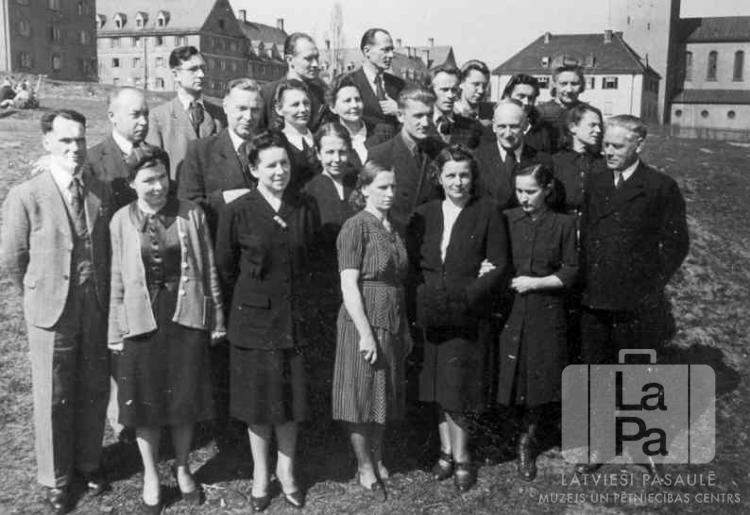 Ausekļa ģimnāzijas skolotāju saime Hohfeldes nometnē Augsburgā (amerikāņu zonā) 1946. gada pavasarī. Cilvēki stāv vairākās rindās. Fonā ir plašs, nelīdzens laukums un vairākstāvu mūra ēkas. Pirmajā rindā, no kreisās: Artūrs Dūmiņš, Malvīne Bertule, Leontīne Ķullīte, E. Mortuzāne, nezināms, Elza Drille un Ernests Aistars (ģimnāzijas direktors). Otrajā rindā, no kreisās: Jānis Stengrevics, Jēkabs Ķullītis (prāvests), nezināms, Nikolājs Zarēvičs, Jānis Zuntaks, Rūdolfs Drillis un Vera Pētersone. Trešajā rindā, no kreisās: pirmais Alfrēds Tauriņš (gaišā uzvalkā), ceturtais Jānis Zuntaks, piektā Zelma Lapiņa. Pēdējā rindā, no kreisās: Alberts Linde, Pēteris Ļubkāns, Magdalēna Rozentāle un Marija Spalviņa.