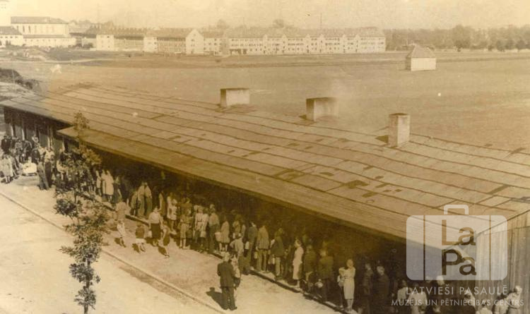 Cilvēku rinda pie virtuves un ēdamzāles Hohfefldes nometnē Augsburgā (amerikāņu zonā). Gara vienstāvu ēka ar trīs skursteņiem. Aiz ēkas ir plašs laukums ar vienu nelielu ēku vidū. Laukuma malā, tālumā, ir daudzas vairākstāvu mūra ēkas.