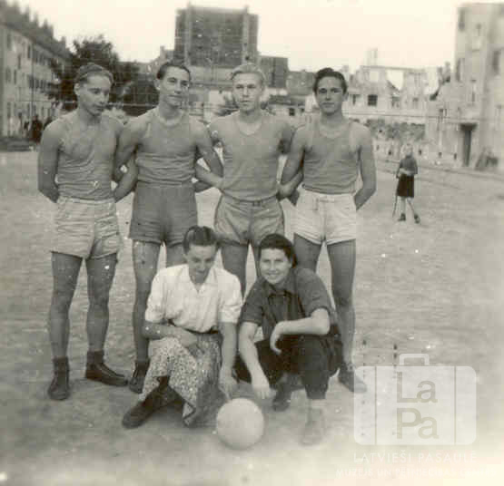 Reālās klases volejbola komanda Hohfeldes nometnē Augsburgā (amerikāņu zonā). Priekšā sēž divas jaunietes, aizmugurē stāv četri puiši kreklos un šortos. Fonā ir laukums; laukuma kreisajā pusē ir vairākstāvu mūra ēka, labajā pusē ir drupas. Priekšā, no kreisās: Valda Bračiņa un Balva Inka. Aizmugurē stāv Raimonds Elsters, Marģers Cubīns, Jānis Richters un Imants Pecholcs.