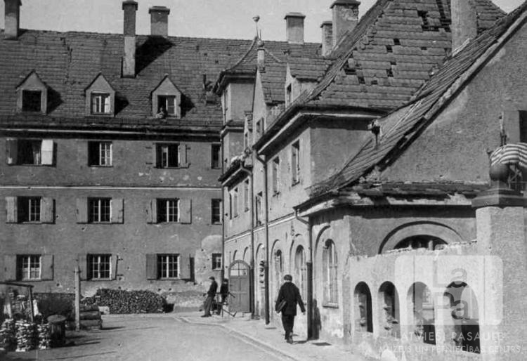Ausekļa ģimnāzijas skolas ēkas aizmugures skats Hohfeldes nometnē Augsburgā (amerikāņu zonā). Gar ēku pastaigājas trīs cilvēki. Priekšplānā, labajā pusē, ir nepabeigtas ēkas mūris. Aizmugurē ir vairākstāvu dzīvojamā ēka.
