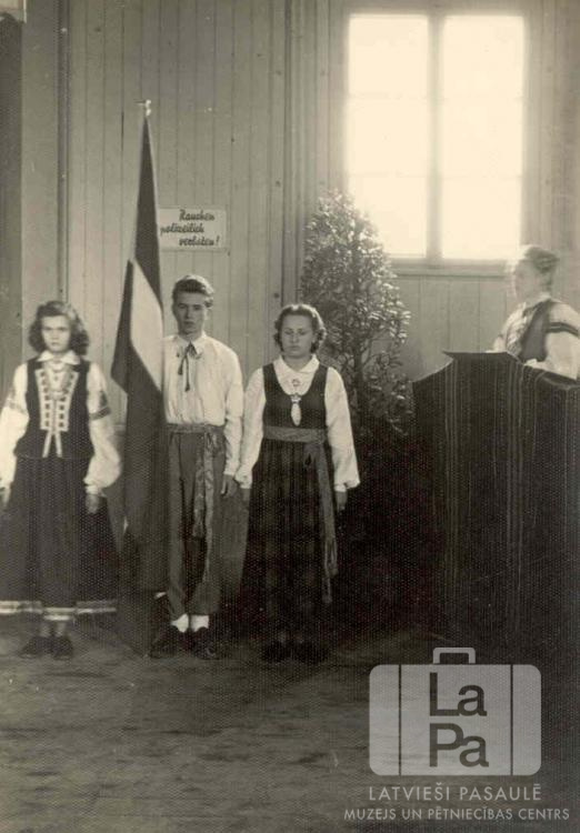 Goda sardze pie Latvijas karoga Ausekļa ģimnāzijas 5. izlaidumā Hohfeldes nometnē Augsburgā (amerikāņu zonā). Labajā pusē, pie kanceles, stāv jauniete. Visas jaunietes ir ģērbušās tautastērpos, puisim ir gaišs krekls, ar prievīti. Pie karoga stāv, no kreisās: M. Sinepe, Andris Ubāns un Dagnija Pārupe.