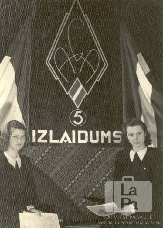 Divas absolventes pie dekorācijas Ausekļa ģimnāzijas 5. izlaidumā Hohfeldes nometnē Augsburgā (amerikāņu zonā). Jaunietēm rokās ir dokumenti. Fonā ir dekorācija ar Latvijas karogiem, ciparu "5" un vārdu "IZLAIDUMS".