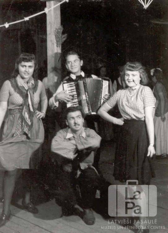 Ausekļa ģimnāzijas jaunieši talantu pasākumā Hohfeldes nometnē Augsburgā (amerikāņu zonā). Četru cilvēku grupa, vienam jauneklim rokās ir akordeons. Aizmugurē ir koka balsts; fonā ir redzami citi jaunieši. Priekšā sēž Ivars Antēns. Aizmugurē, no kreisās: Ināra Šulca, Eižens Vlasovs un Rasma Kuplēna.