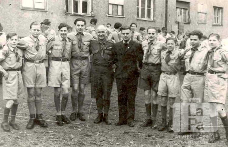 Raunas 81. skautu vienības Baložu kops ierindā Hohfeldes nometnē Augsburgā (amerikāņu zonā). Visi ir ģērbušies skautu formastērpos. Aizmugurē pastaigājas citi skauti; fonā ir mūra ēka ar pirmā stāva logiem. Ierindā stāv, no kreisās: I. Ruģelis, E. Menģis, I. Veidemanis, I. Kalniņš, P. Vīlips (Lielupes novada priekšnieks), K. Freimanis (vienības priekšnieks), A, Ronis (kopnieks), L. Melķis, G. Ramanis un S. Krolls.