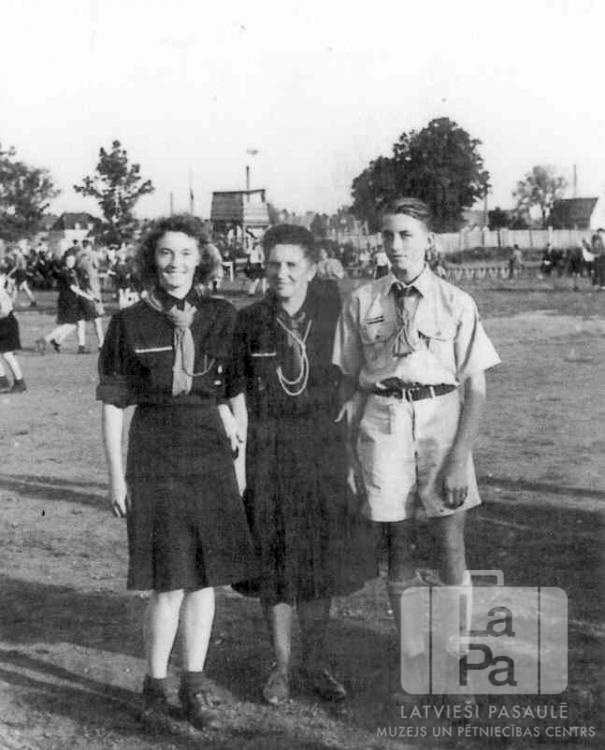 Gaidu vadītāja Anna Cubīna ar bērniem Hohfeldes nometnē Augsburgā (amerikāņu zonā). Māte, meita un dēls, visi ģērbušies skautu/ gaidu formastērpos. Fonā ir cilvēku pilns laukums. Tajā ir redzams arī koka tornis. Aiz laukuma ir žogs un mūra ēkas. Priekšā, no kreisās: Inta Cubīna, Anna Cubīna (skautu vadītāja) un Marģers Cubīns.