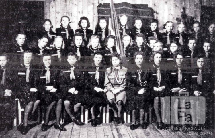 Raunas 78. gaidu vienības lielgaidu grupa Hohfeldes nometnē Augsburgā (amerikāņu zonā). Liela jaunu sieviešu grupa trīs rindās iekštelpās. Pēdējā rindā, vidū, jaunietes tur Latvijas karogu. Attēls ir ar platu svītru pa vidu.