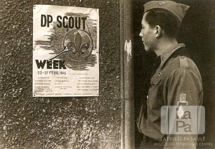 Raunas 81. skautu vienības rovers Ritvars Āsbergs pēta afišu Hohfeldes nometnē Augsburgā (amerikāņu zonā). Nelielā afiša ir piestiprināta pie mūra ēkas sienas; uz tās ir rakstīts: "DP SCOUT / WEEK / 20-27 FEBR. 1949". Pārējais afišas teksts ir nesalasāms.