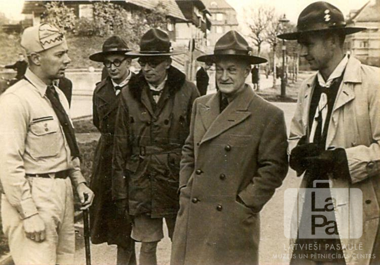 Starptautiskā skautu biroja vadītāji apciemo Raunas 81. skautu vienību Hohfeldes nometnē Augsburgā (amerikāņu zonā). Pieci vīrieši stāv dažādos skautu formastērpos. Fonā ir iela ar apstādījumiem; abpus ielai ir redzamas vairākas mūra ēkas. Priekšā, no kreisās: V. Balodis (vienības priekšnieks, vadītājs), ? Mone (pārstāvis), ? Vilsons (pārstāvis) un ? Michelsons (igauņu vadītājs).