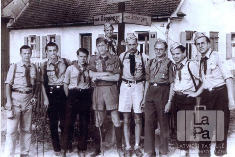 Raunas 81. skautu vienības roveri no Hohfeldes nometnes Augsburgā (amerikāņu zonā) dodas sirojumā pa Švābu zemi. Deviņi vīrieši skautu formastērpos; astoņi stāv priekšā, devītais aizmugurē ir pakāpies uz virzienu norāžu staba. Fonā ir vienstāvu mūra ēka. Priekšā, no kreisās: V. Balodis (vienības priekšnieks, vadītājs), Egons Inka, Alfrēds Paeglis, Ritvars Āsbergs, Jānis Kokins, Ojārs Štāks (vadītājs), Gunārs Ramanis un Ivars Antēns. Aizmugurē uz staba: Ilgvars Veidemanis.