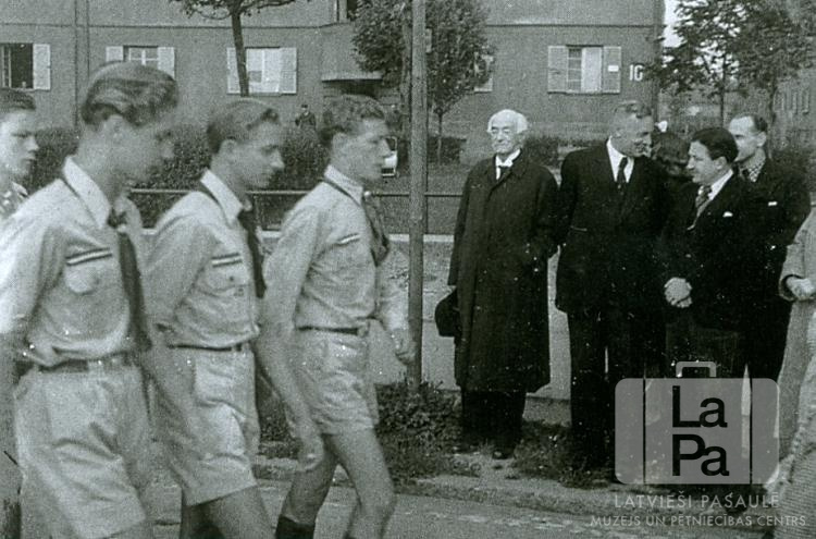 Raunas 81. skautu vienības roveri soļo uz savu mītni pēc Latvijas karoga uzvilkšanas Hohfeldes nometnē Augsburgā (amerikāņu zonā). Skauti formastērpos soļo pa ielu; gar ielas malu stāv skatītāji – kungi tumšos mēteļos. Fonā ir mūra ēka ar nelielu zālāju tās priekšā. Ielas malā aug vairāki tievi koki. Priekšplānā, no kreisās: otrais Jānis Ozoliņš (rovers), ceturtais Ziedonis Upīte (rovers), piektais Teodors Grīnbergs (arhibīskaps, stāv ielas malā) un J. Ķullītis (prāvests).