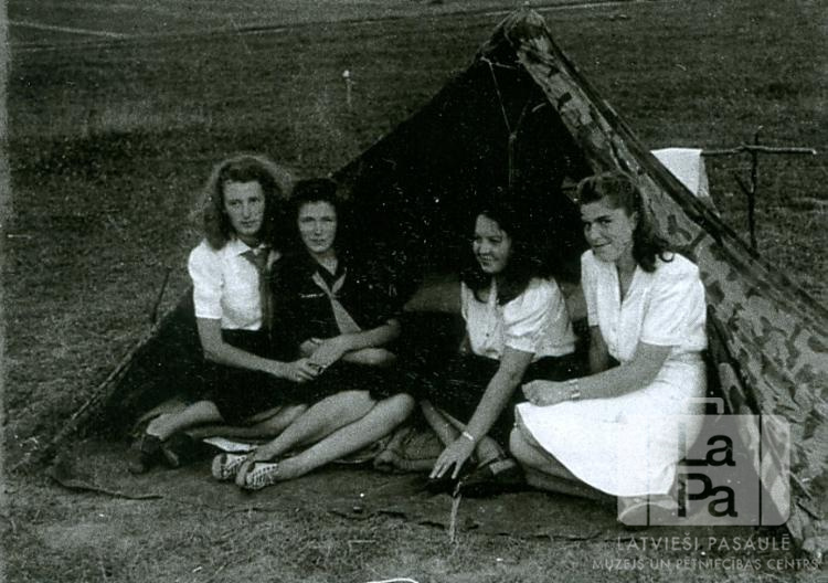 Raunas 78. gaidu vienības lielgaidas no Hohfeldes nometnes Augsburgā (amerikāņu zonā) sēž pļavā pie savas nometnes telts 1948. gada vasarā. No kreisās: Biruta Kalēja (pr. Abuls), Melita Jaunzeme, nezināms un Agnese Burtniece.