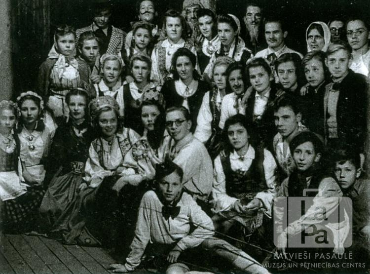 Raunas 78. gaidu un Raunas 81. skautu vienības savā Mārtiņu vakara sarīkojumā Hohfeldes nometnē Augsburgā (amerikāņu zonā). Liela bērnu un jauniešu grupa dažādos tērpos un maskās. Vairākas jaunietes ir ģērbušās tautastērpos. Trešajā rindā, piektā no kreisās (grupas vidū): Anna Cubīna (gaidu vienības priekšniece, vadītāja). Pēdējā rindā, trešais no kreisās (pie staba, ar gaišo parūku): Imants Nīgals (skautu vienības priekšnieks, vadītājs).