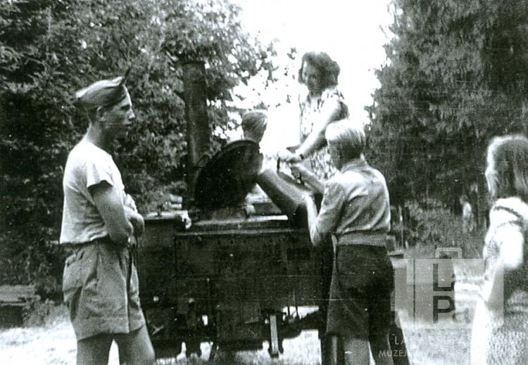 Raunas 81. skautu vienības skauti un Raunas 78. gaidu vienības lielgaidas darbojas ap armijas lauku virtuves iekārtu mazskautu nometnē pie Hohfeldes nometnes Augsburgā (amerikāņu zonā) 1948. gada vasarā. Iekārtu dēvēja par "Putras liegabalu". Fonā ir mežs. Priekšā, pirmais no kreisās: Ritvars Asbergs (skautu vienības vadītāja vietnieks formastērpā).