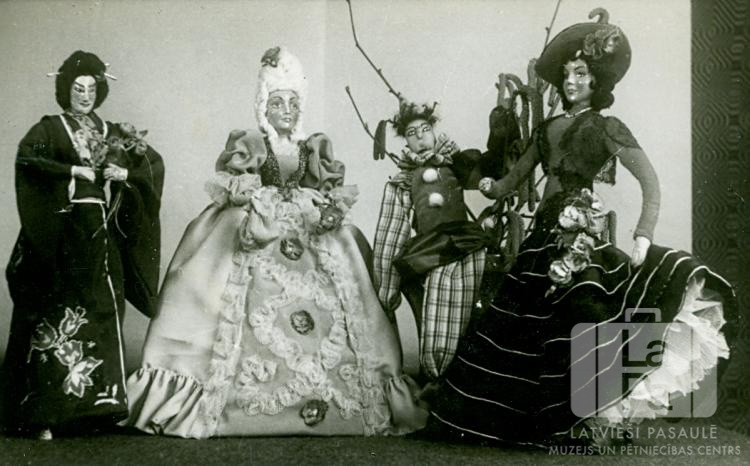 Četras lelles rokdarbu izstādē Centrālajā nometnē Vircburgā (amerikāņu zonā). Izstādi veidoja nometnes rokdarbnieču grupa. Lelles attēlo sievietes tērpus dažādos laikos un sabiedrībās: japāņu kimono tērpā, renesanses galma kleitā, 20. gadsimta sākuma tērpā (?). Ceturtā lelle, iespējams, ir klauns/ āksts.