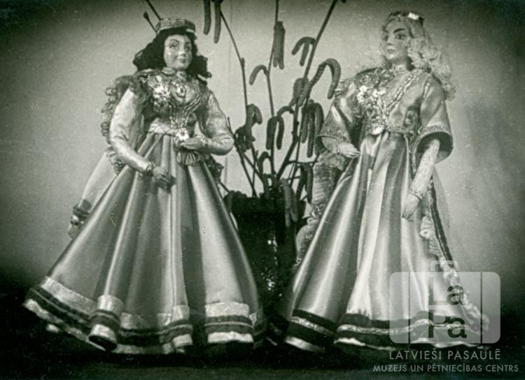 Divas lelles rokdarbu izstādē Centrālajā nometnē Vircburgā (amerikāņu zonā). Izstādi veidoja nometnes rokdarbnieču grupa. Abas lelles attēlo sievietes greznās, spīdīgās kleitās, ar kroni galvā. Fonā ir māla krūka, kurā ir ievietoti zari.
