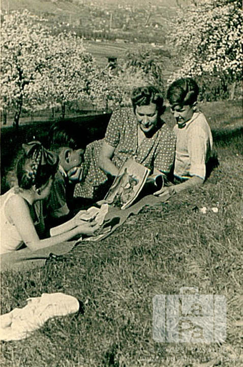 Zemmeru ģimene atpūšas uz nogāzes pie Eslingenes (amerikāņu zonā) 1948. gada pavasarī. Viens zēns lasa komiksu. Fonā ir ziedošs augļu koku dārzs; tālumā, aiz laukiem ir Eslingene. No kreisās: Vija Zemmers, Māris Zemmers, Nellija Zemmers un Juris Kelers. Foto autors: Roberts Zommers.