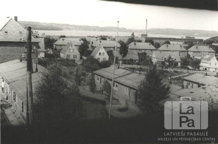 Mūra ēkas un ielas Mirvikas nometnē Flensburgā (angļu zonā). Skats no augšas. Tālumā ir redzama jūra ar, iespējams, otro jūras līča krastu. Attēlam ir tumša augša un apakša.