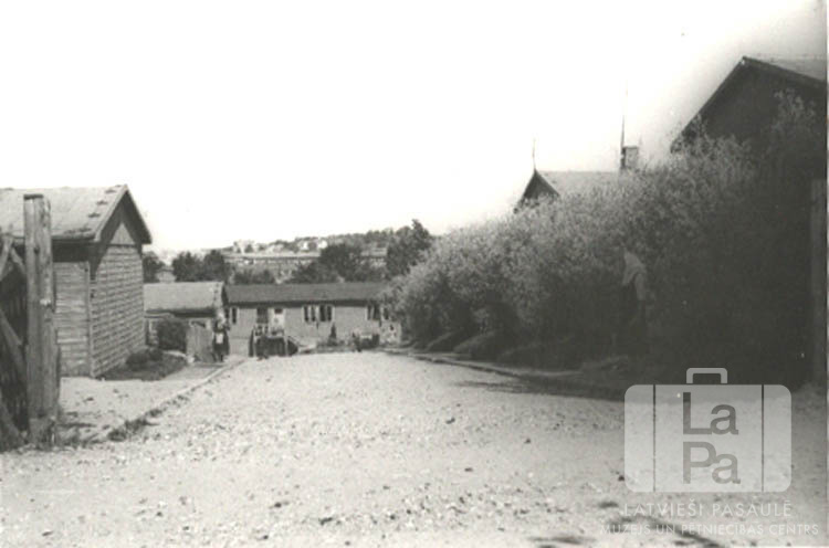 Iela Mirvikas nometnē Flensburgā (amerikāņu zonā). Priekšplānā, kreisajā ielas pusē, ir vienstāvu koka ēka. Labajā pusē ielas malā ir krūmi, aiz tām ir redzami māju jumti. Lejpus ielai, tās galā pastaigājas cilvēki; tur ir vēl vairākas vienstāvu ēkas.