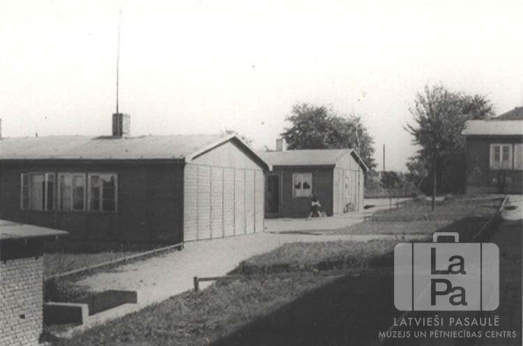 Vienstāvu koka barakas Mirvikas nometnē Flensburgā (angļu zonā). Pa vidu tām ir gājēju takas un zālāji.