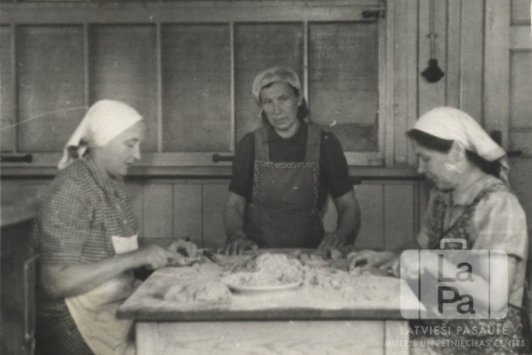 Trīs virtuves darbinieces gatavo pusdienas bērniem Flensburgā (angļu zonā). Sievietes pie galda kaut ko griež, uz galda ir izbērti milti. Otrā no kreisās: Matilde Sakss (saimniece).
