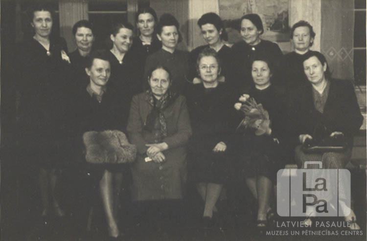 Dāmu komiteja ar lūgtām dāmām atvadīšanās vakarā Mirvikas nometnē Flensburgā (angļu zonā). Vienai sievietei pirmajā rindā rokās ir kažokāda, citai rokās ir puķes (tulpes). Fonā telpas logi un glezna pie sienas. Pirmajā rindā, no kreisās: ceturtā ? Avotiņa (ar puķēm), piektā Matilde Sakss. Otrajā rindā, no kreisās: otrā ? Zvaigzne, trešā ? Stratmalis, ceturtā ? Izand, piektā ? Kapteinis, sestā ? Kalviškis un septītā ? Vītoliņš.