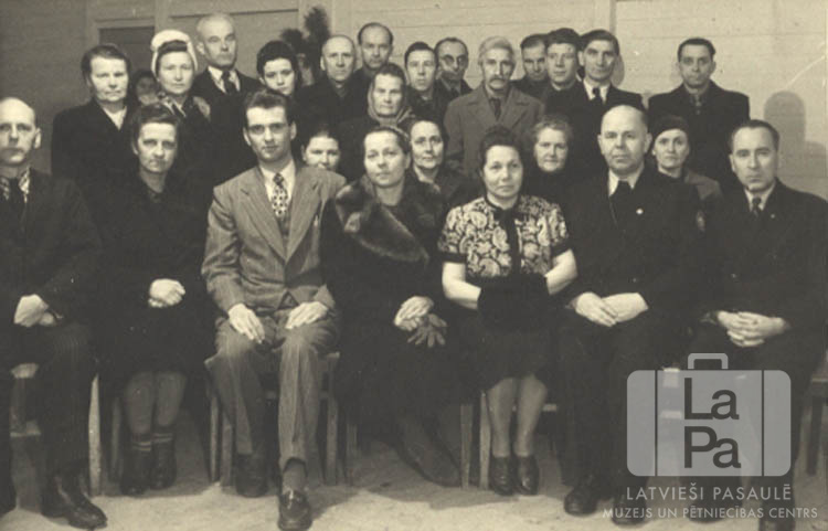Pasaules luterāņu federācijas pārstāvja Herberta Brokeringa viesošanās Mirvikas nometnē Flensburgā (angļu zonā). Liela cilvēku grupa. Pirmajā rindā, no kreisās: pirmais ? Avotiņš (mācītājs), trešais Herberts Brokerings, piektā ? Avotiņa, sestais ? Kņazknazinckis, septītais Edgars Lange.