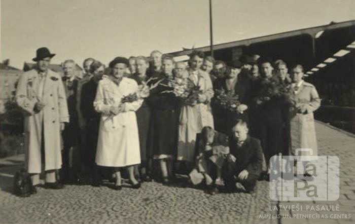 Liela cilvēku grupa mēteļos vilciena stacijā Rendsburgā (angļu zonā), pirmajām ģimenēm izceļojot uz ASV. Vairākiem cilvēkiem rokās ir ziedi. Priekšā divi zēni ir notupušies; pārējās rindas stāv kājās. Fonā kreisajā pusē ir mūra ēkas, bet labajā pusē – vilcienu perons.