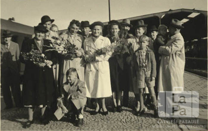 Liela cilvēku grupa mēteļos vilciena stacijā Rendsburgā (angļu zonā), pirmajām ģimenēm izceļojot uz ASV. Vairākiem cilvēkiem rokās ir ziedi. Priekšā viens zēns ir notupies; pārējie cilvēki stāv kājās. Fonā labajā pusē ir vilcienu perons.