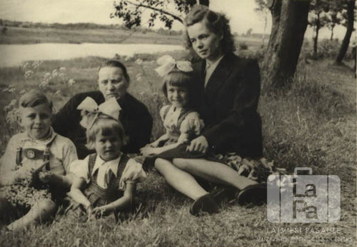 Divas sievietes un trīs bērni sēž zālē pastaigas laikā Rendsburgā (angļu zonā). Visi sēž zālē, aizmugurē, labajā pusē, ir koki. Fonā kreisajā pusē ir šaurs kanāls ar zemiem krastiem. Priekšā sēž, no kreisās: Andrejs Auziņš, Z. Sproģis, Ināra ?, Ingrīda ?. Aizmugurē sēž: Irma Pavars.
