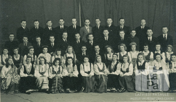 Latviešu koris Ziemeļu nometnē Vircburgā (amerikāņu zonā). Liels koris četrās rindās; sievietes tautastērpos sēž pirmajās divās rindās, vīrieši melnos uzvalkos stāv pēdējās divās rindās. Otrajā rindā, vidū, sēž arī Žanis Smiltnieks (diriģents) un cits nezināms vīrietis.