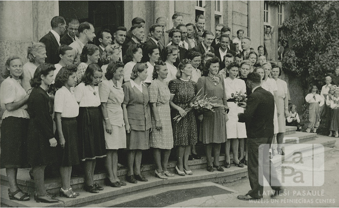 Latviešu koris no Ziemeļu nometnes Vircburgā (amerikāņu zonā) uzstājas Lorā (iespējams, tuberkolozes sanatorijā). Koris vairākās rindās stāv uz kādas ēkas kāpnēm, priekšā stāv diriģents. Diriģentam un vienai sievietei pirmajā rindā rokās ir ziedi. Fonā labajā pusē ir redzami skatītāji, arī mazas meitenes tautastērpos un sieviete stāvus atvērta loga ailē. Kora priekšā ar muguru stāv: Žanis Smiltnieks (diriģents).