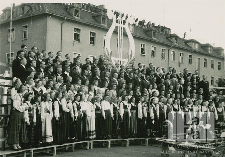 Liels kopkoris dzied Dziesmu svētkos Vircburgā (amerikāņu zonā). Piedalās kori no vairākām latviešu nometnēm. Pirmajās trīs kora rindās stāv sievietes tautastērpos, pēdējās trīs rindās – vīrieši uzvalkos. Aiz kora ir augsta dekorācija. Fonā ir vairākstāvu mūra ēka, kuras logos un uz jumta stāv skatītāji.