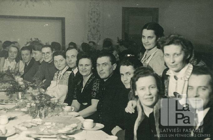 Ziemeļu nometnes koris Vircburgā (amerikāņu zonā) sēž ap garu svētku galdu pēc koncerta. Uz galda ir trauki ar ēdienu, tases un skujkoku (?) zari. Dažas sievietes sēž tautastērpos, vīrieši – uzvalkos. Fonā sēž citi cilvēki pie gariem galdiem. Starp galdiem pastaigājas divas sievietes. Par šo gadījumu Mirdza Grāmatiņš (dz. Klēbachs) stāsta: "Fotogrāfijā var redzēt visiem tautas tērpus, protams, paņemti līdz no mājām."