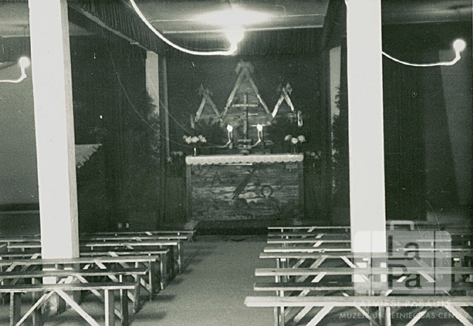 Solu rindas un altāris baznīcā Ziemeļu nometnē Vircburgā (amerikāņu zonā). Priekšplānā ir koka soli ar eju pa vidu. Starp soliem ir divas, gaišas kolonnas. Solu vidus eja ved uz altāri telpas galā. Altāris ir veidots no koka, ar kokgriezumiem. Uz altāra ir aizdegtas sveces un ziedi vāzēs; virs altāra ir krusts. Foto autors: T. Kauls.