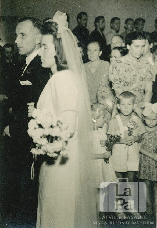 Alfrēda Grāmatiņa un Mirdzas Kalnietes kāzas Ziemeļu nometnes baznīcā Vircburgā (amerikāņu zonā). Kāzu pāris priekšplānā, līgavai rokās ir ziedi. Gar eju stāv mazi bērni ar ziediem, aiz viņiem stāv pieaugušie. Fonā var redzēt daļu no nometnes kora. Priekšplānā, kreisajā pusē, no kreisās: Alfrēds Grāmatiņš, Mirdza Kalniete (pr. Grāmatiņš). Mazie bērni ejas malā aiz jaunā pāra, no kreisās: Rudīte Ozoliņa, Andrejs Stīpnieks, Māra Rudzīte. Foto autors: T. Kauls.