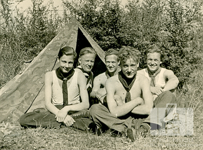 Pieci Juglas 94. skautu vienības skauti no Karslrūes nometnes (amerikāņu zonā) sēž zālē pie telts vasaras nometnē Zogfordelungā (?) 1949. gada vasarā. Fonā krūmi. Priekšā, pirmais no kreisās: Helmuts Brants.