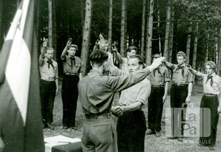 Imulas 58. skautu vienības roveru dzimta no Centrālās nometnes Vircburgā (amerikāņu zonā) dod roveru solījumu. Vidū divi vīrieši sarokojas, aizmugurē stāv skautu ierinda formastērpos. Priekšplānā, kreisajā pusē, ir Latvijas karogs. Fonā mežs. Par šo gadījumu dāvinātājs stāsta: "Roveri savu svinīgo solījumu dod ar saules lēktu pēc vientulībā pie sava ugunskurā pavadītas pārdomu nakts. Solījumu dod ar lielo sveicienu, paceltu roku ar trīs pirkstiem, diemžēl lielais sveiciens ir līdzīgs aizliegtam fašistu sveicienam, un tāpēc nezinātāji to nopēla."