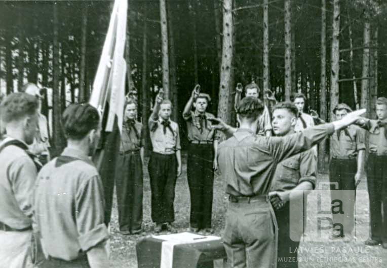 Imulas 58. skautu vienības roveru dzimta no Centrālās nometnes Vircburgā (amerikāņu zonā) dod roveru solījumu. Vidū divi skauti sarokojas, aizmugurē stāv skautu ierinda formastērpos. Priekšplānā, kreisajā pusē, stāv divi skauti ar Latvijas karogu. Fonā mežs.