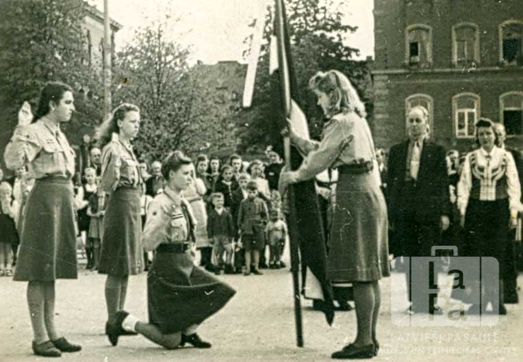 Amulas 6. gaidu vienības gaidas saņem savas vienības karogu Centrālajā nometnē Vircburgā (amerikāņu zonā). Priekšplānā sieviete nodod Latvijas karogu trim gaidām, no kurām viena ir nometusies uz labā ceļa. Aizmugurē, labajā pusē, stāv vīrietis uzvalkā un sieviete tautastērpā. Fonā stāv skatītāji, aiz viņiem ir koki un vairākstāvu mūra ēkas.
