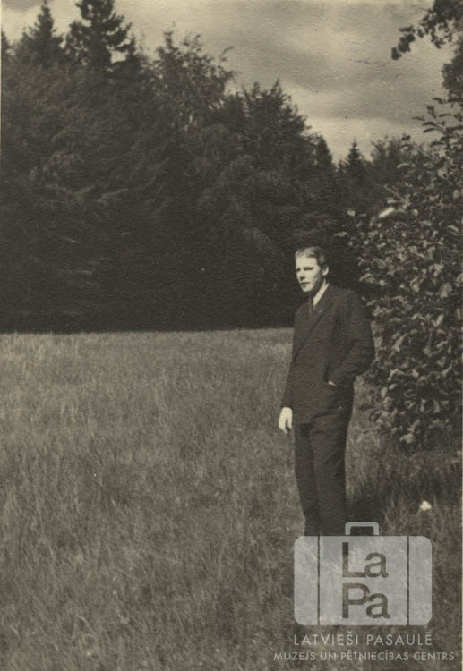 Nikolajs Upans stāv klajumā pie Vartas nometnes Lēzē (angļu zonā). Fonā ir mežs ar skujkokiem. Par šo gadījumu Nikolajs Upans stāsta: "Es – šķiet domās par nākotni."